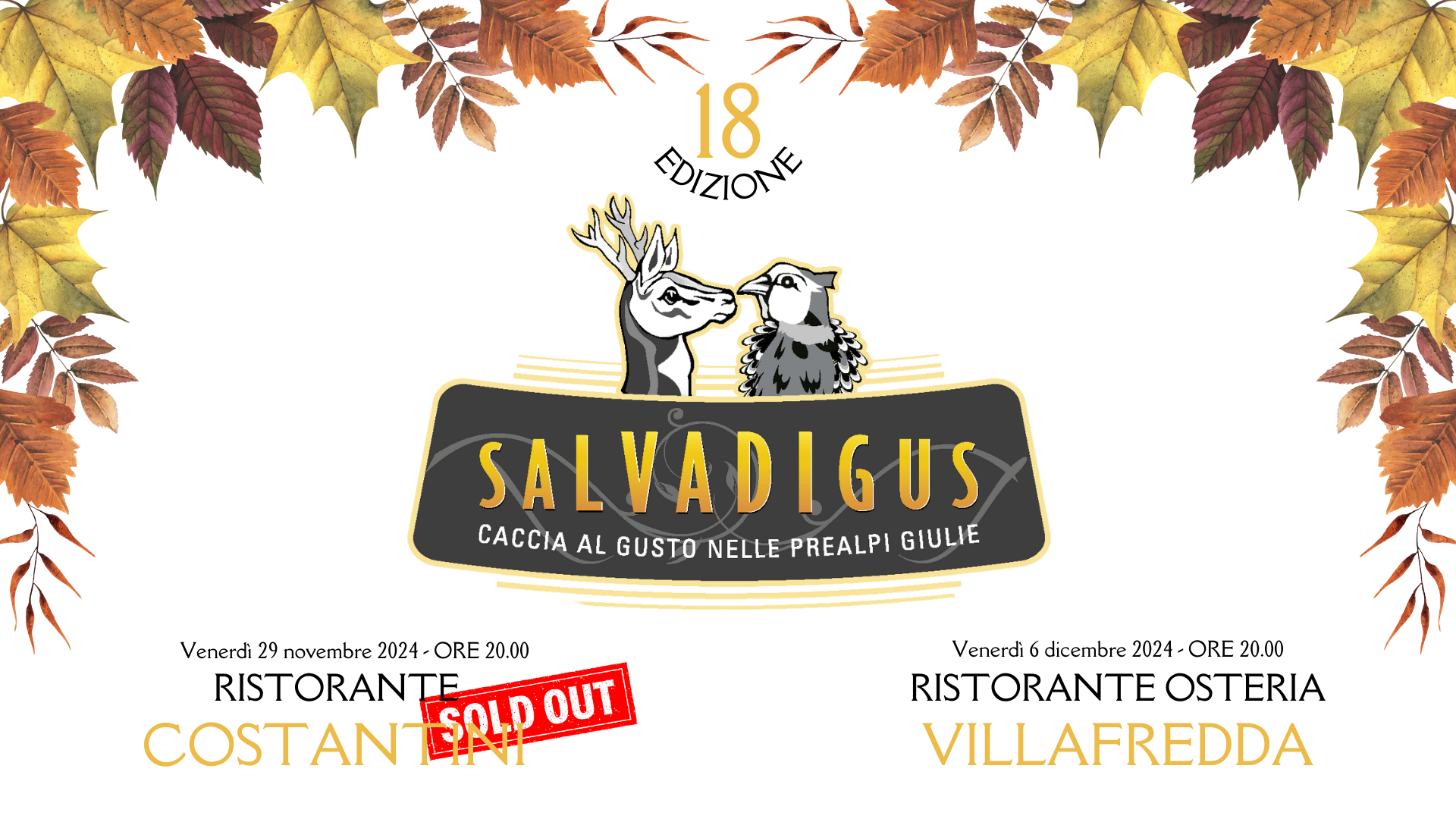 Salvadigus è un’esperienza gastronomica itinerante, concepita come un “percorso di caccia”. Quest’anno, un doppio appuntamento: il 29 novembre presso il Ristorante Costantini e il 6 dicembre all’Osteria Villafredda. Ogni evento propone piatti esclusivi di selvaggina, per soddisfare i gusti di tutti gli appassionati. Dai sapori decisi di lepre, capriolo, cervo e cinghiale, fino alla delicatezza della pernice, sapremo esaltare ogni ingrediente con ricette della cucina locale, pensate per sorprendere ogni palato.