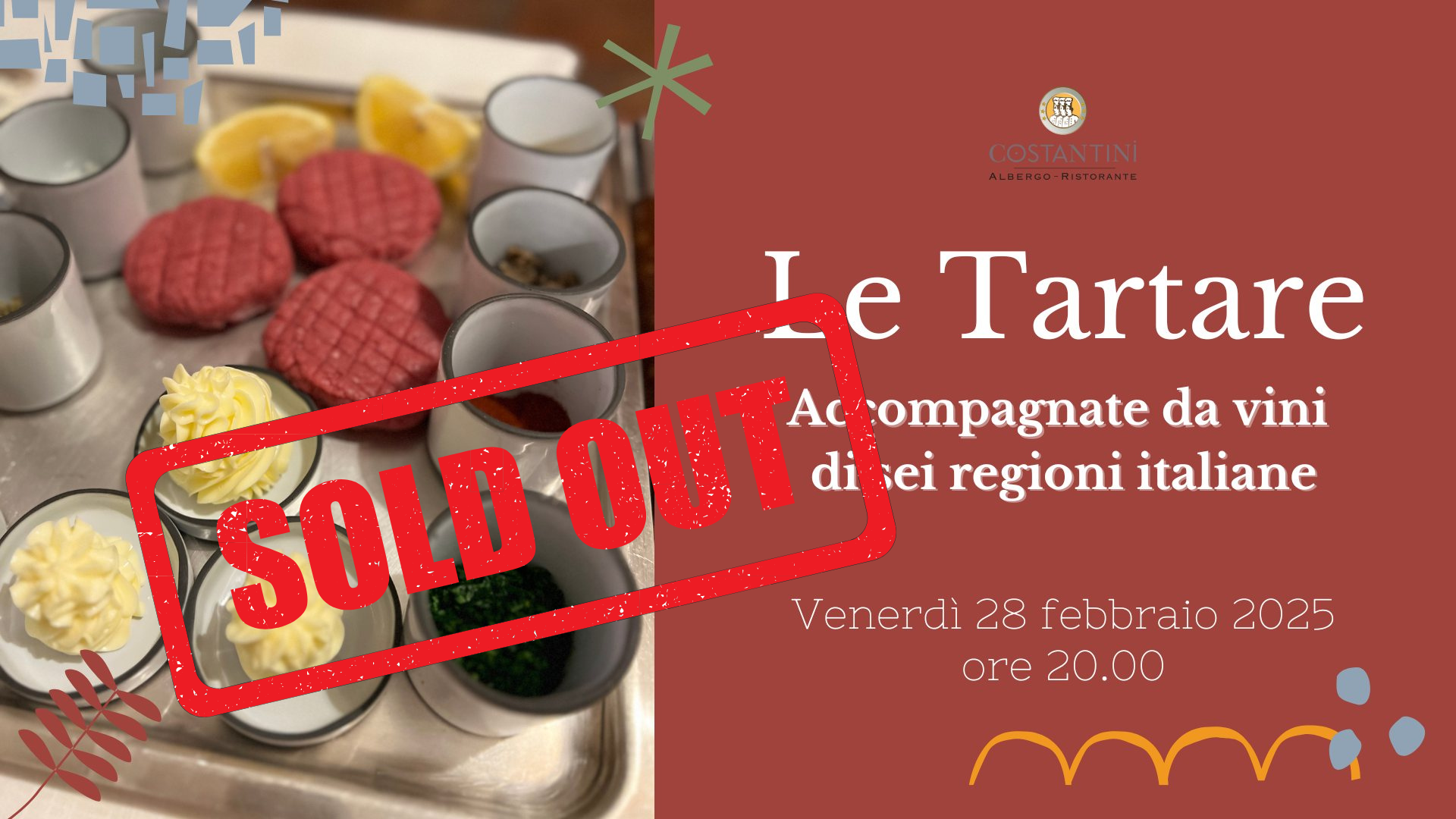 Al Ristorante Costantini, le tartare sono un vero e proprio simbolo della nostra cucina, un must che prepariamo con passione sin dai nostri inizi, nel 1976. Venerdì 28 febbraio alle ore 20.00, vi invitiamo a un’esperienza esclusiva: la nostra annuale serata dedicata alle tartare, abbinate a vini selezionati da sei regioni diverse.